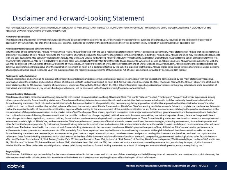 2 Disclaimer and Forward-Looking Statement 2 Morgan Stanley Healthcare Conference| September 10, 2014 | © 2014 NOT FOR RELEASE, PUBLICATION OR DISTRIBUTION, IN WHOLE OR IN PART, DIRECTLY OR INDIRECTLY, IN, INTO OR FROM ANY JURISDICTION WHERE TO DO SO WOULD CONSTITUTE A VIOLATION OF THE RELEVANT LAWS OR REGULATIONS OF SUCH JURISDICTION No Offer or Solicitation This document is provided for informational purposes only and does not constitute an offer to sell, or an invitation to subscribe for, purchase or exchange, any securities or the solicitation of any vote or approval in any jurisdiction, nor shall there be any sale, issuance, exchange or transfer of the securities referred to in this document in any jurisdiction in contravention of applicable law. Additional Information and Where to Find It In furtherance of the combination, AbbVie Private Limited (New AbbVie) has filed with the SEC a registration statement on Form S-4 containing a preliminary Proxy Statement of AbbVie that also constitutes a preliminary Prospectus of New AbbVie relating to the New AbbVie Shares to be issued to New AbbVie Stockholders in the combination. In addition, AbbVie, New AbbVie and Shire may file additional documents with the SEC. INVESTORS AND SECURITY HOLDERS OF ABBVIE AND SHIRE ARE URGED TO READ THE PROXY STATEMENT/PROSPECTUS, AND OTHER DOCUMENTS FILED WITH THE SEC IN CONNECTION WITH THE TRANSACTION, CAREFULLY AND IN THEIR ENTIRETY, BECAUSE THEY WILL CONTAIN IMPORTANT INFORMATION. Those documents, when filed, as well as AbbVies and New AbbVies other public filings with the SEC may be obtained without charge at the SECs website at www.sec.gov, at AbbVies website at www.abbvieinvestor.com and at Shires website at www.shire.com. AbbVie plans to mail its stockholders the definitive proxy statement/prospectus after the registration statement on Form S-4 is declared effective by the SEC. It is expected that the New AbbVie shares to be issued to Shire shareholders under a scheme of arrangement will be issued in reliance upon the exemption from the registration requirements of the Securities Act of 1933, as amended, provided by Section 3(a)(10) thereof. Participants in the Solicitation AbbVie, its directors and certain of its executive officers may be considered participants in the solicitation of proxies in connection with the transactions contemplated by the Proxy Statement/Prospectus. Information about the directors and executive officers of AbbVie is set forth in its Annual Report on Form 10-K for the year ended December 31, 2013, which was filed with the SEC on February 21, 2014, and its proxy statement for its 2014 annual meeting of stockholders, which was filed with the SEC on March 24, 2014. Other information regarding potential participants in the proxy solicitations and a description of their direct and indirect interests, by security holdings or otherwise, will be contained in the Proxy Statement/Prospectus when it is filed. Forward-Looking Statements This document contains certain forward-looking statements with respect to a combination involving AbbVie and Shire. The words believe, expect, anticipate, project and similar expressions, among others, generally identify forward-looking statements. These forward-looking statements are subject to risks and uncertainties that may cause actual results to differ materially from those indicated in the forward-looking statements. Such risks and uncertainties include, but are not limited to, the possibility that necessary regulatory approvals or stockholder approvals will not be obtained or any of the other conditions to the combination will not be satisfied, adverse effects on the market price of AbbVie Shares and on AbbVies or Shires operating results because of a failure to complete the combination, failure to realise the expected benefits of the possible combination, negative effects relating to the announcement of the possible combination or any further announcements relating to the possible combination or the consummation of the possible combination on the market price of AbbVie shares or Shire shares, significant transaction costs and/or unknown liabilities, general economic and business conditions that affect the combined companies following the consummation of the possible combination, changes in global, political, economic, business, competitive, market and regulatory forces, future exchange and interest rates, changes in tax laws, regulations, rates and policies, future business combinations or disposals and competitive developments. These forward-looking statements are based on numerous assumptions and assessments made in light of AbbVies or, as the case may be, Shires experience and perception of historical trends, current conditions, business strategies, operating environment, future developments and other factors it believes appropriate. By their nature, forward-looking statements involve known and unknown risks and uncertainties because they relate to events and depend on circumstances that will occur in the future. The factors described in the context of such forward-looking statements in this document could cause AbbVies plans with respect to Shire, AbbVies or Shires actual results, performance or achievements, industry results and developments to differ materially from those expressed in or implied by such forward-looking statements. Although it is believed that the expectations reflected in such forward-looking statements are reasonable, no assurance can be given that such expectations will prove to have been correct and persons reading this document are therefore cautioned not to place undue reliance on these forward-looking statements which speak only as at the date of this document. Additional information about economic, competitive, governmental, technological and other factors that may affect AbbVie is set forth in Item 1A, Risk Factors, in AbbVies 2013 Annual Report on Form 10-K, in Item 1A, Risk Factors of Part II of AbbVies second qua