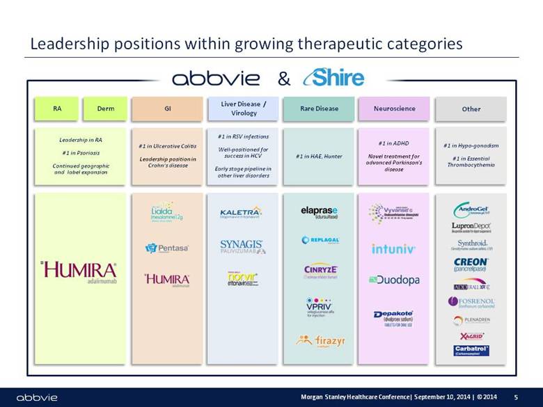 A strategically compelling and financially attractive combination 4 Proposed combination would strengthen our position as a global biopharmaceutical leader & Transaction gives us the opportunity to diversify, expand and augment our product portfolio Creates larger and more diversified company with significant financial capacity for future strategic investment and increased shareholder returns Adds leading franchises within specialty therapeutic areas, including rare disease and neuroscience Broad and deep pipeline of diverse development programs and enhanced R&D capabilities Transaction expected to achieve a competitive tax structure and provide New AbbVie with enhanced access to its global cash flows Strategic and Financial Benefits Expected to Enhance Long-Term Value for Shareholders Morgan Stanley Healthcare Conference| September 10, 2014 | © 2014 |