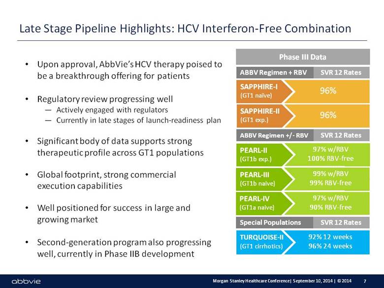 Complementary pipeline positioned to enhance innovation 6 Notes: Shire pipeline shown excludes geographic expansion of marketed products and products currently on clinical hold Certain assets being developed in collaboration with partner companies Morgan Stanley Healthcare Conference| September 10, 2014 | © 2014 Phase I Phase II Phase III Registration Interferon Free Combo: HCV Humira: Pediatric Crohns disease Duopa: Parkinsons Disease ABT-199: CLL Veliparib: NSCLC Veliparib: Neoadjuvant Breast Cancer Veliparib: BRCA Breast Cancer Elotuzumab: Multiple Myeloma Duvelisib: CLL Daclizumab: Multiple Sclerosis Atrasentan: Diabetic Nephropathy Elagolix: Endometriosis Humira: Uveitis Veliparib: WBRT for brain mets Veliparib: Ovarian Cancer ABT-199: AML Duvelisib: iNHL 2nd gen pangenotypic: HCV ABT-122: RA ABT-494: RA GLPG 0634: RA GLPG-0634: Crohns Disease ALV-003: Celiac Disease ABT-981: Osteoarthritis BT061: RA ALX-0061: RA ABT-399: Solid Tumors ABT-165: Solid Tumors ABT-414: Glioblastoma RTA-ABT 408: Solid Tumors ABT-700: Solid Tumors ABT-199: SLE ABT-257: RA ABBV-672: Alzheimer's disease ABT-354: Alzheimer's disease ABT-957: Alzheimer's disease ABT-126: Schizophrenia ABT-436: Alcohol Use Disorder SHP-465: ADHD Lifitegrast: Dry Eye Vyvanse: Binge Eating Firazyr: ACE Angioedema SHP-609: Hunters SHP-610: Sanfilippo A LUM001: 4 rare hepatic diseases Premiplex: Retinopathy of Premature infants SHP-613: Acute Vascular Repair Maribavir: CMV in transplant patients SHP-611: MLD SHP-622: Friedreichs ataxia CINRYZE IV: HAE Prophylaxis CINRYZE SC: HAE Prophylaxis FT-011: Renal Impairment Oncology Immunology/GI Neuroscience Rare Disease HCV/Liver disease Renal Ophthalmology Womens Health Elagolix: Uterine Fibroids Humira: Hidradenitis Suppurativa RTA-ABT 408: Ocular Inflammation LUMOO2: NASH |