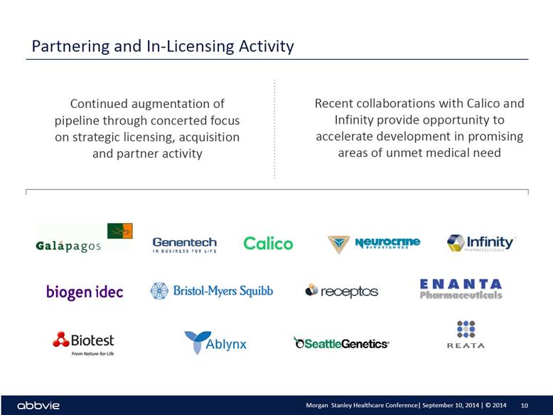 Multiple Myeloma (Phase III) SLAMF7 Elotuzumab Late-Stage Pipeline Highlights: Oncology 8 Compound Veliparib Chronic Lymphocytic Leukemia (Phase III) Acute Myelogenous Leukemia and Other Hematologic Malignancies (Phase II) Neoadjuvant treatment of TNBC (Phase III) Squamous NSCLC (Phase III) BRCA Breast (Phase III) Brain Metastasis and Other Cancers (Phase II) Indication Morgan Stanley Healthcare Conference| September 10, 2014 | © 2014 ABT-199 Bcl-2 inhibitor PARP inhibitor Mechanism Duvelisib Chronic Lymphocytic Leukemia (Phase III) Indolent Non-Hodgkin Lymphoma (Phase II) Dual PI3K inhibitor |