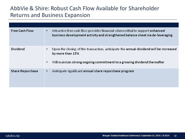 AbbVie & Shire: Enhanced Financial Profile Offers Compelling and Sustainable Growth Opportunity 11 Revenue Combined company has potential for meaningful revenue growth, driven by on-market products, as well as the launch of assets from rich late-stage pipeline Revenue base further diversified by the combination Accretion Expected to be accretive to adjusted EPS in the first year following completion and to increase to more than $1.00 per share by 20201 Synergies Upon full integration, expect to achieve meaningful synergies Tax Rate Forecasting a tax rate for the combined company of ~13% by 2016 EPS Growth Combined company positioned to deliver margin expansion and double digit earnings growth over the long term1 Morgan Stanley Healthcare Conference| September 10, 2014 | © 2014 1 Adjusted EPS excludes intangible asset amortization expense and purchase accounting adjustments and other specified items. The statement that the Transaction is earning accretive should not be construed as a profit forecast and is therefore not subject to the requirements of Rule 28 of the Code. It should not be interpreted to mean that the earnings per share in any future financial period will necessarily match or be greater than those for the relevant preceding financial period. |