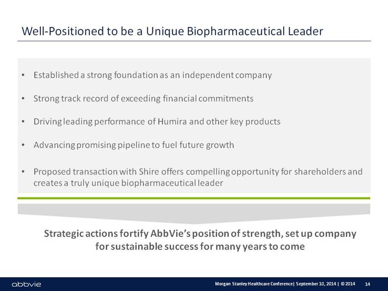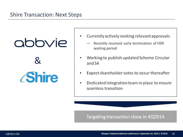 AbbVie & Shire: Robust Cash Flow Available for Shareholder Returns and Business Expansion 12 Free Cash Flow Attractive free cash flow provides financial wherewithal to support enhanced business development activity and strengthened balance sheet via de-leveraging Dividend Upon the closing of the transaction, anticipate the annual dividend will be increased by more than 15% Will maintain strong ongoing commitment to a growing dividend thereafter Share Repurchase Anticipate significant annual share repurchase program Morgan Stanley Healthcare Conference| September 10, 2014 | © 2014 |